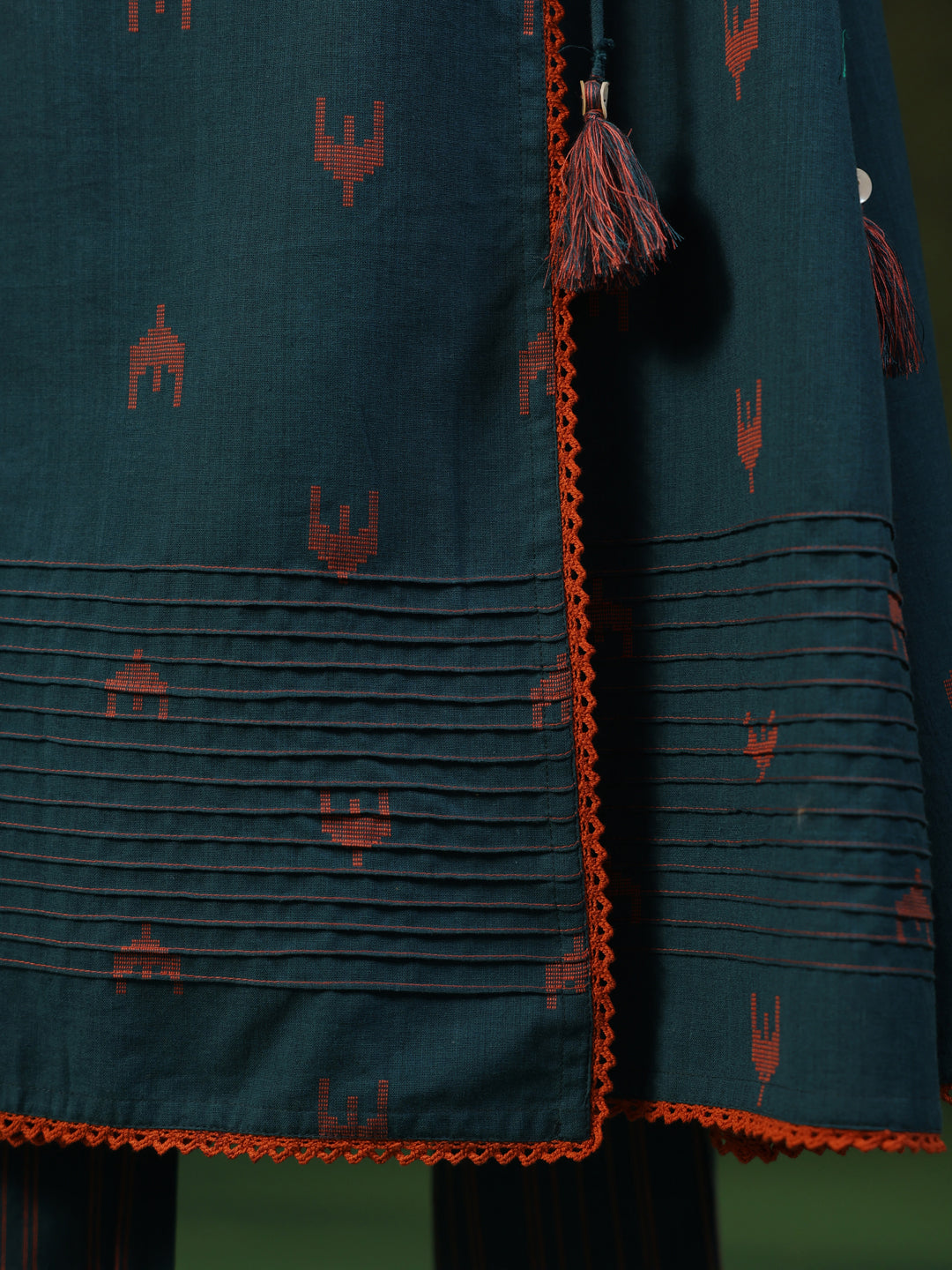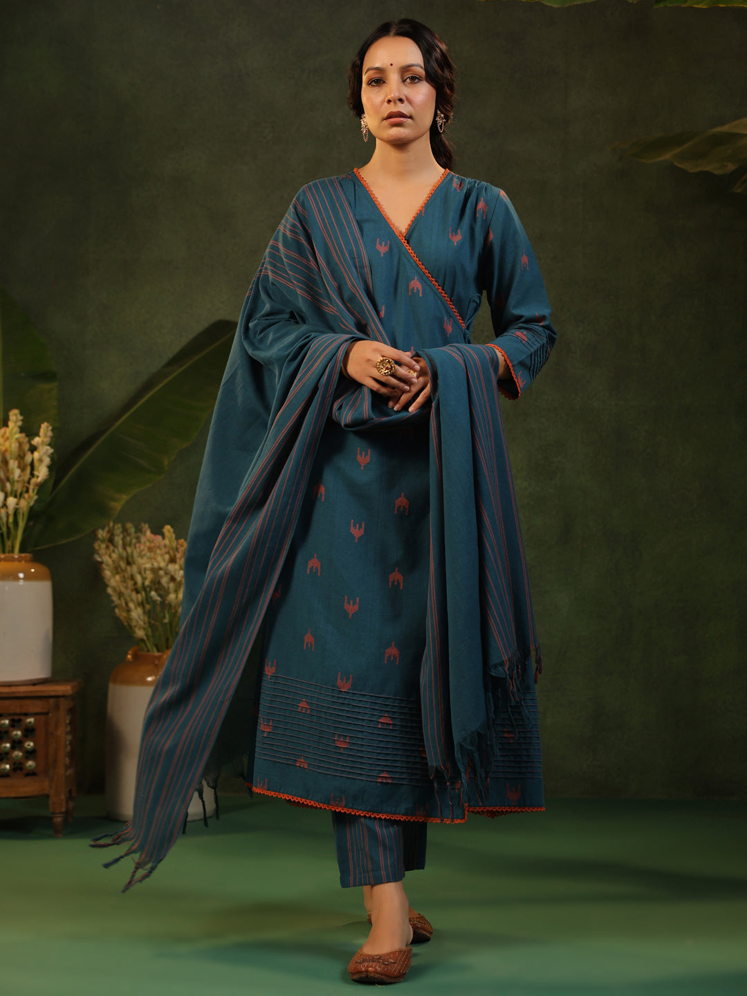 This blue suit set features orange woven motif. The kurta is designed in a wrap-around style with a knot detail inside and outside, highlighted by orange lace running from the neckline to the hem and along the sleeves. Pintuck detailing adds texture on the sleeves and at the bottom hem of the kurti. It is paired with striped pants and a matching striped dupatta, and styled with simple Indian jewellery and traditional juttis.
