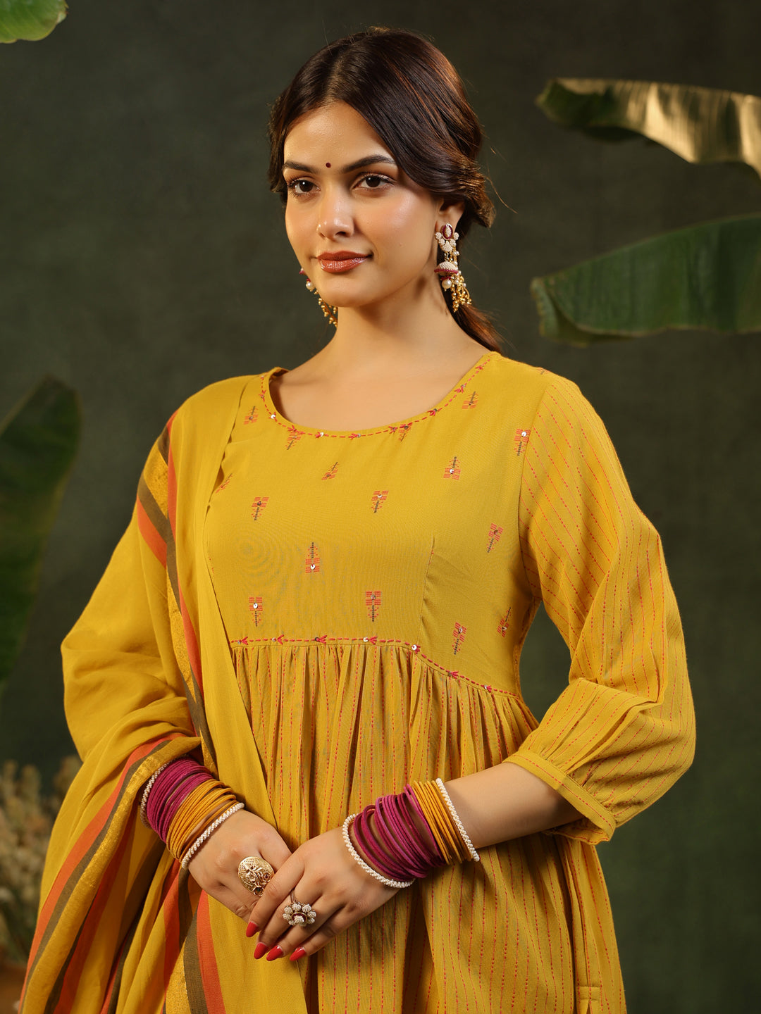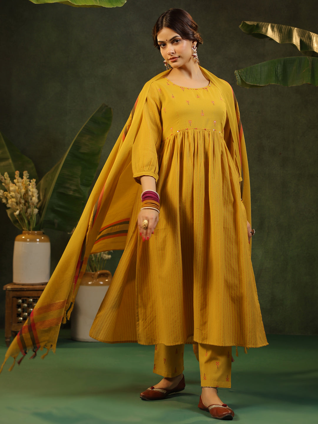 A beautiful yellow set done with delicate pink motifs. The kurta features gathers at waist and side slits that add both comfort and effortless style. Fine kantha stitching, accented with subtle sequin work, highlights the neckline, while the dupatta is finished with elegant golden zari detailing and tassels along the hem. Slightly puffed sleeves with gentle gathers lend a graceful charm. The look is completed with straight pants featuring a functional pocket, styled with traditional Indian jewellery and classic juttis.